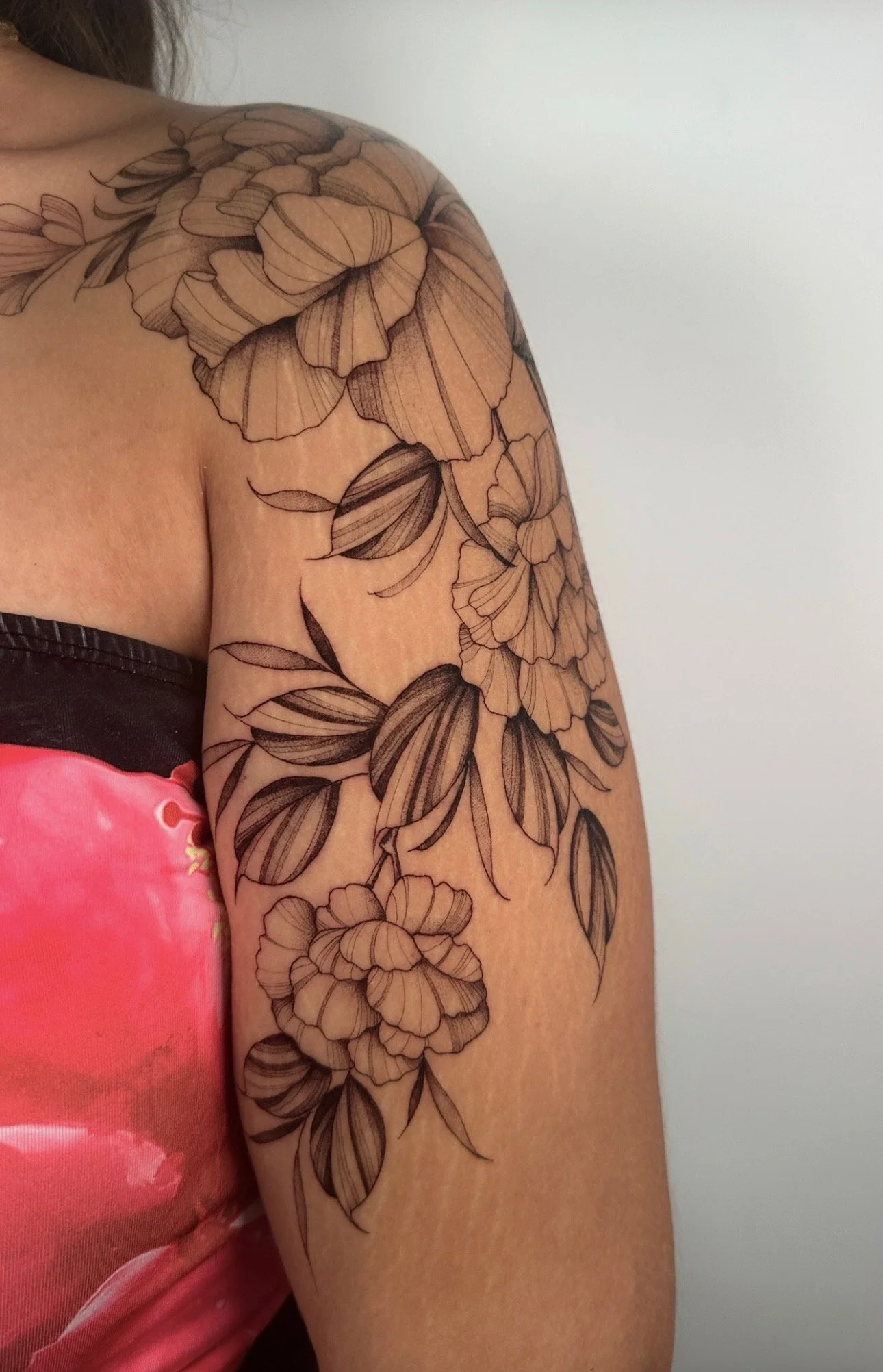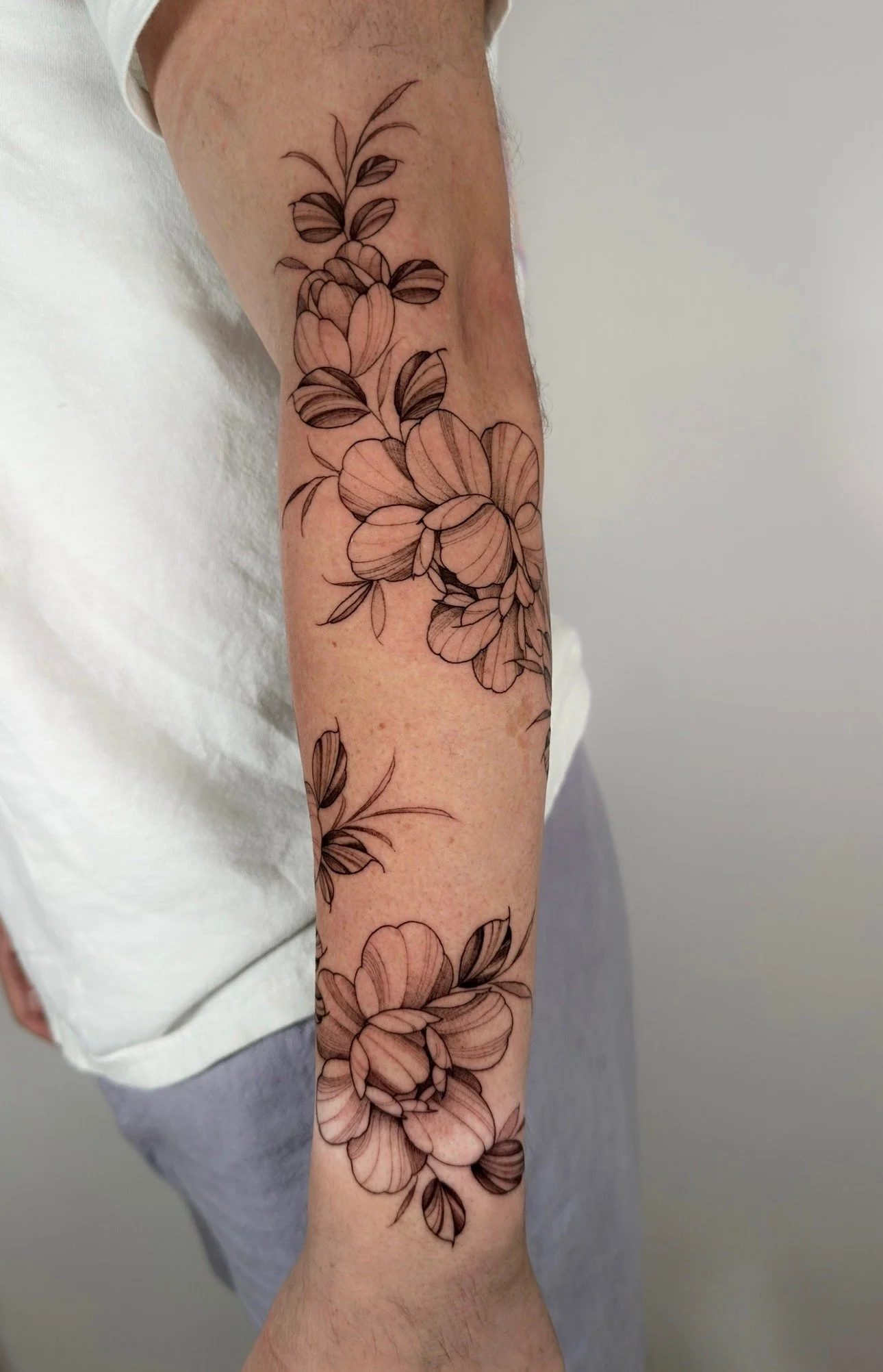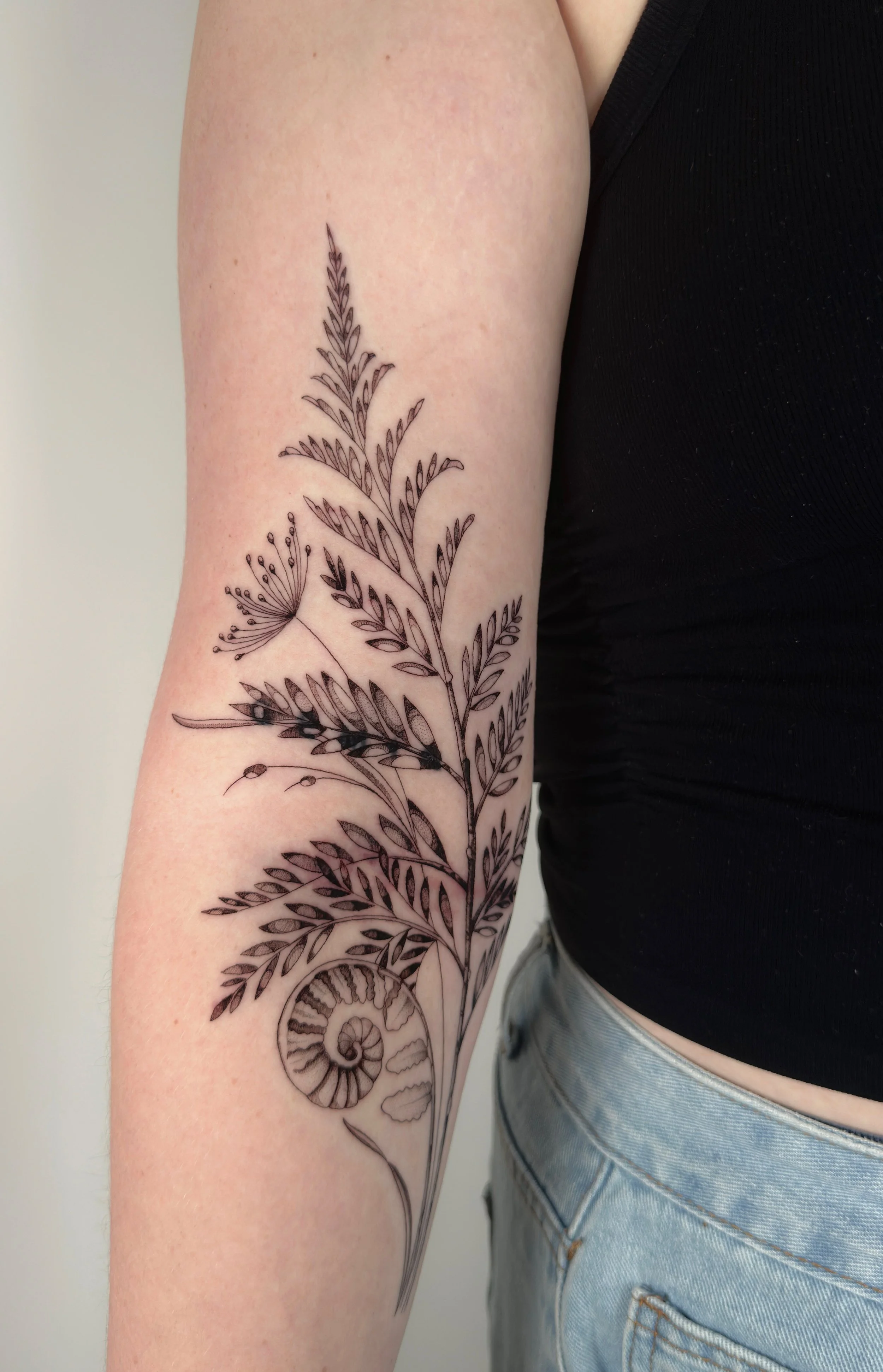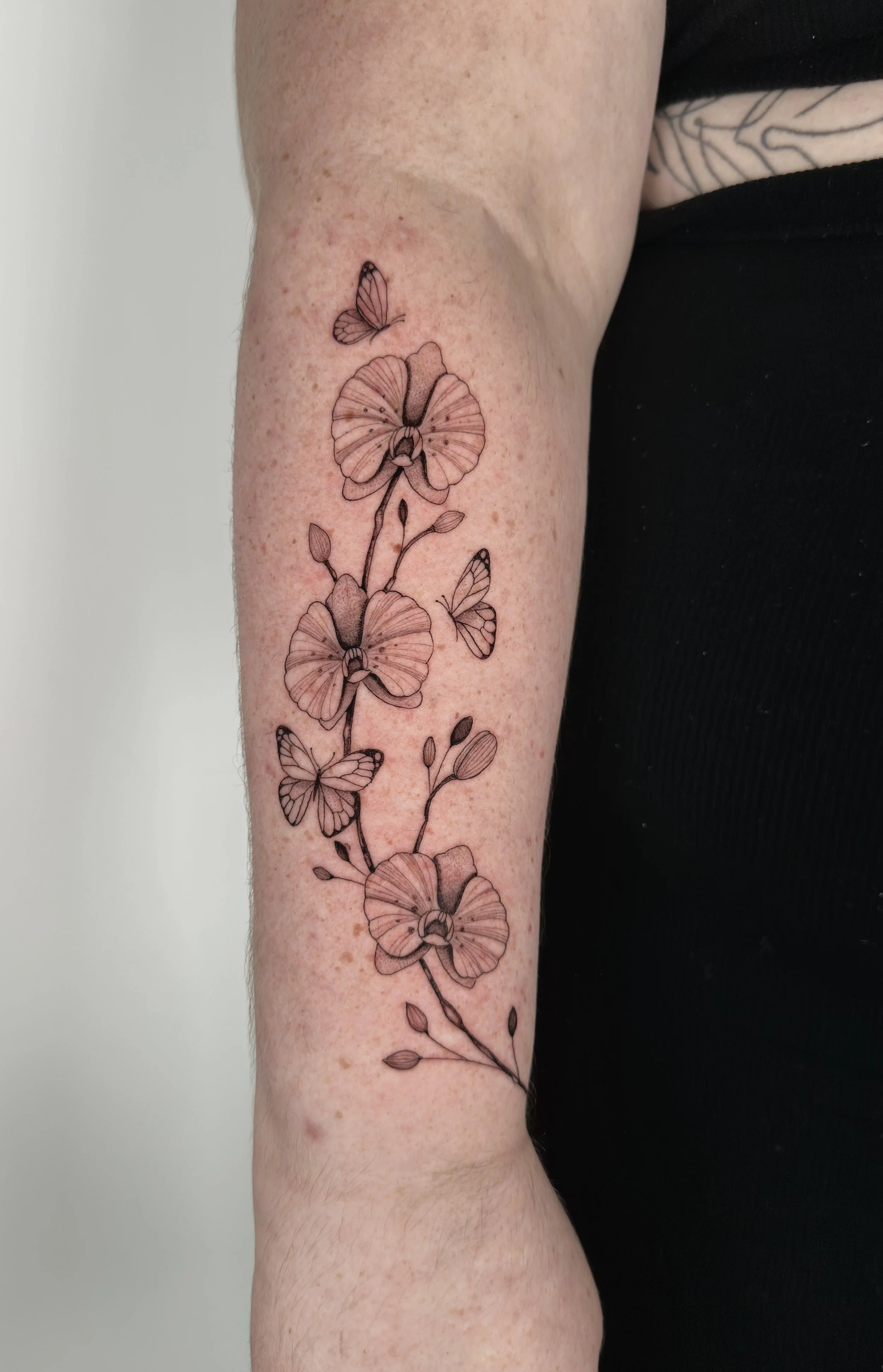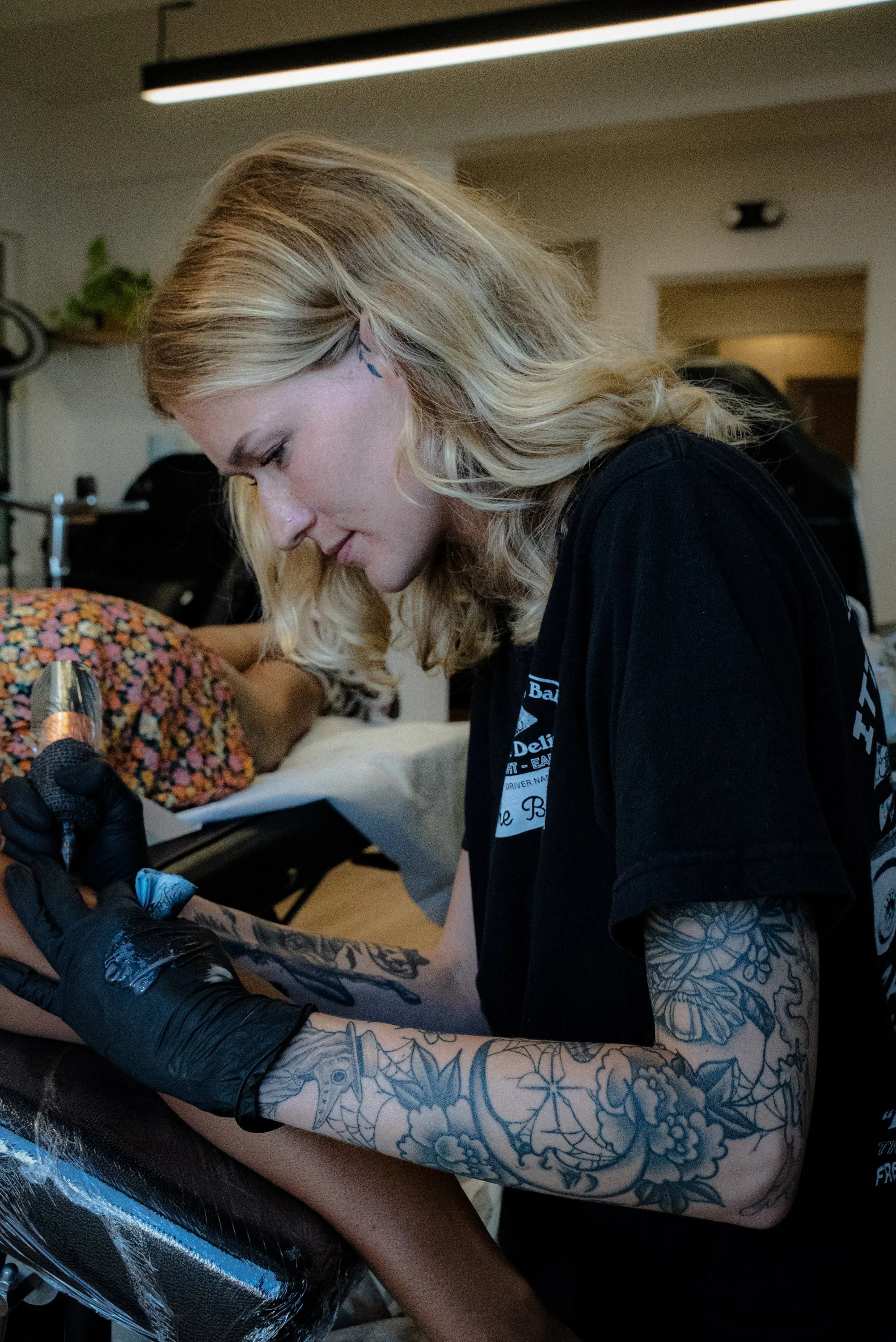 Sarah grew up in a small Minnesota farm town and discovered her passion for tattooing in 2022. She now specializes in black-and-grey fine line stipple work, focusing on floral, botanical, and nature-inspired designs.