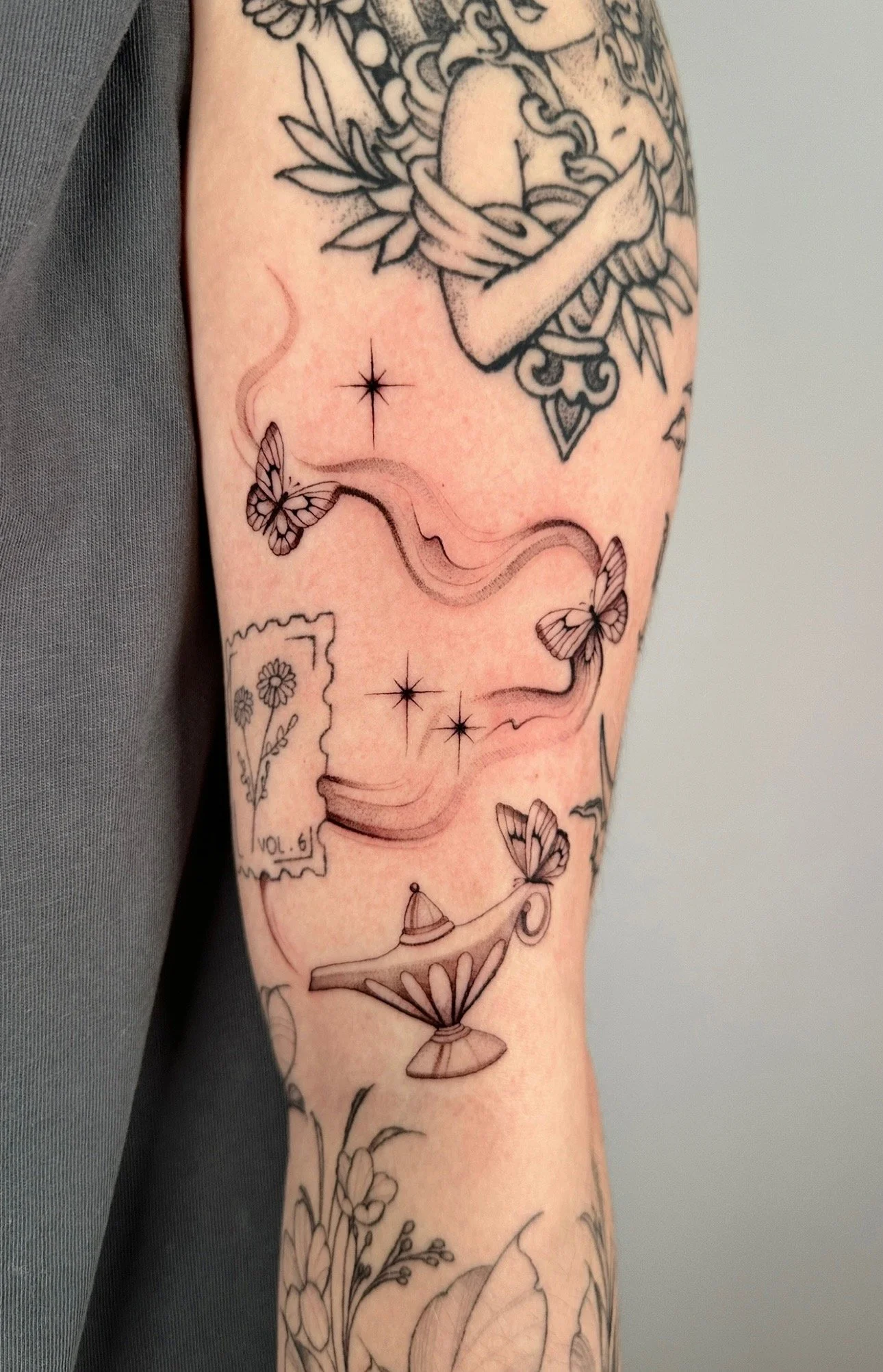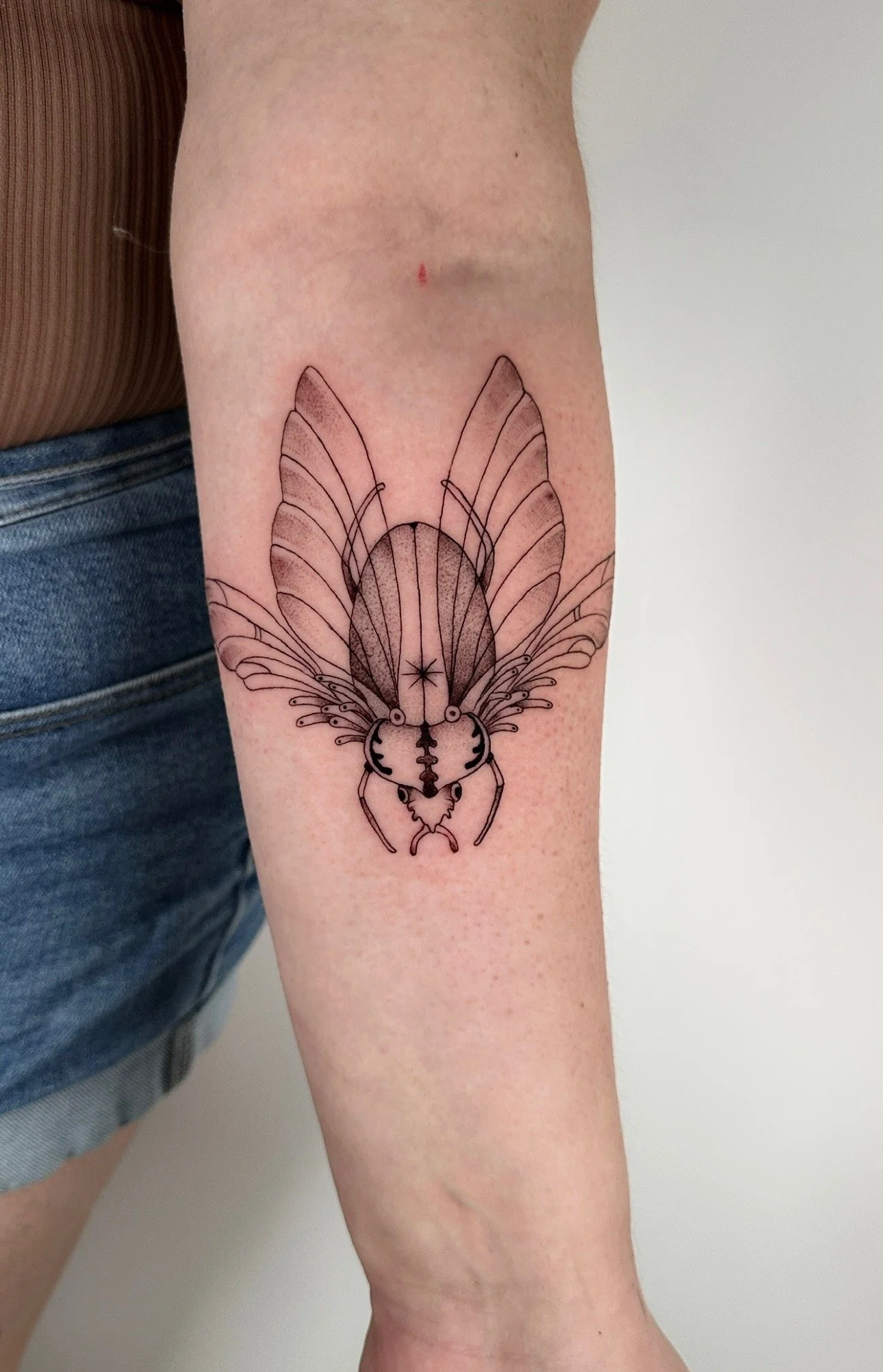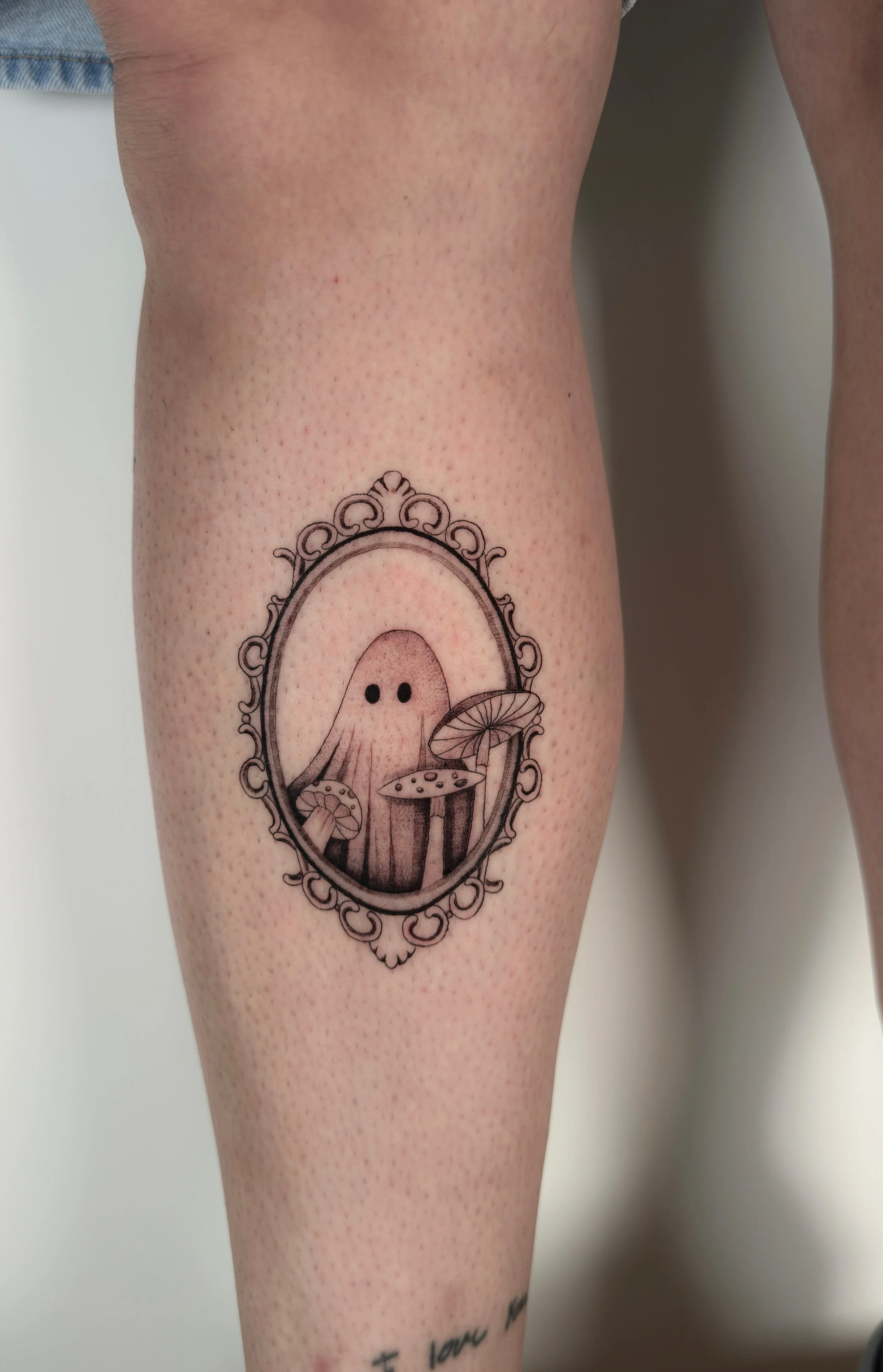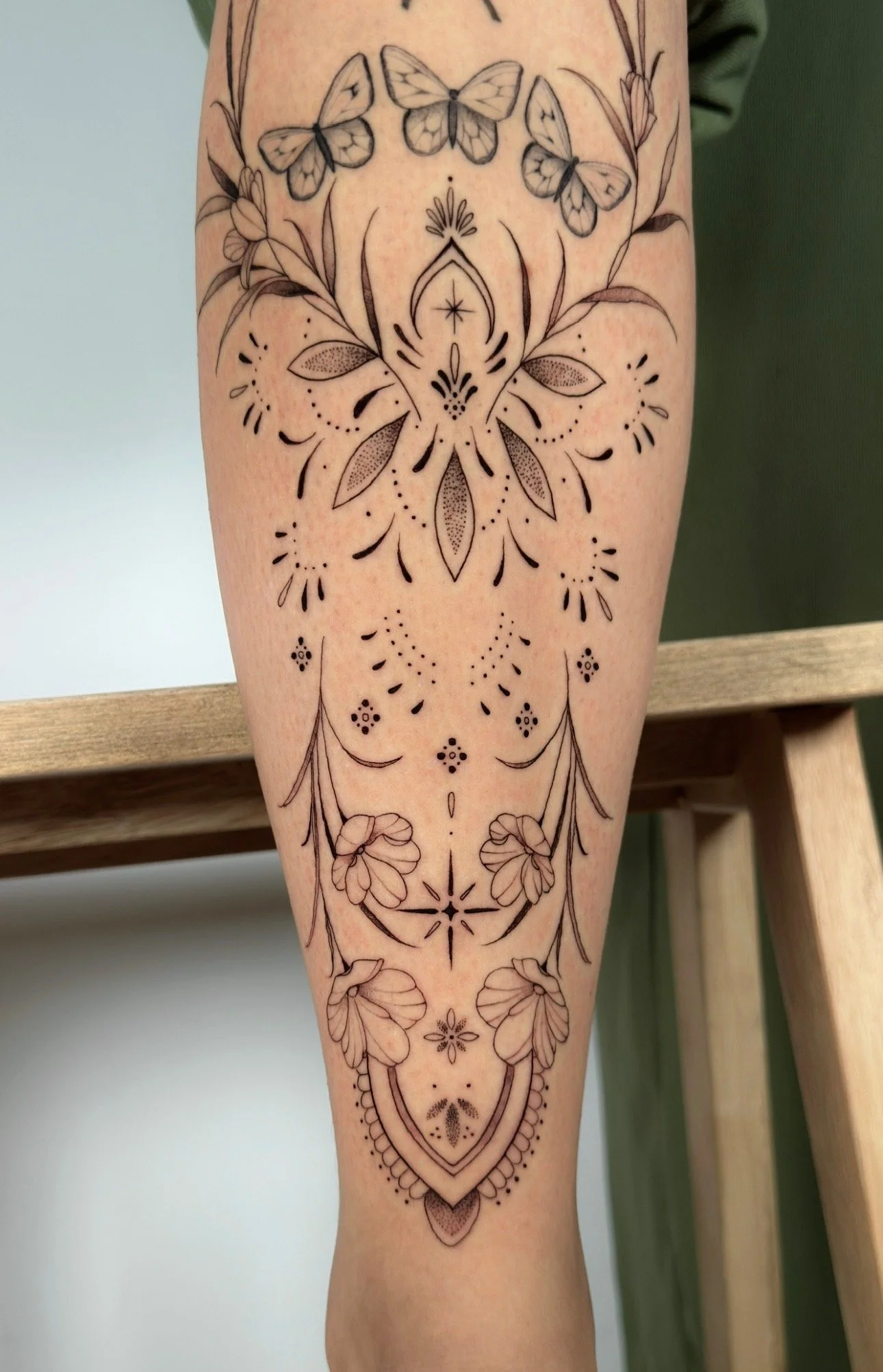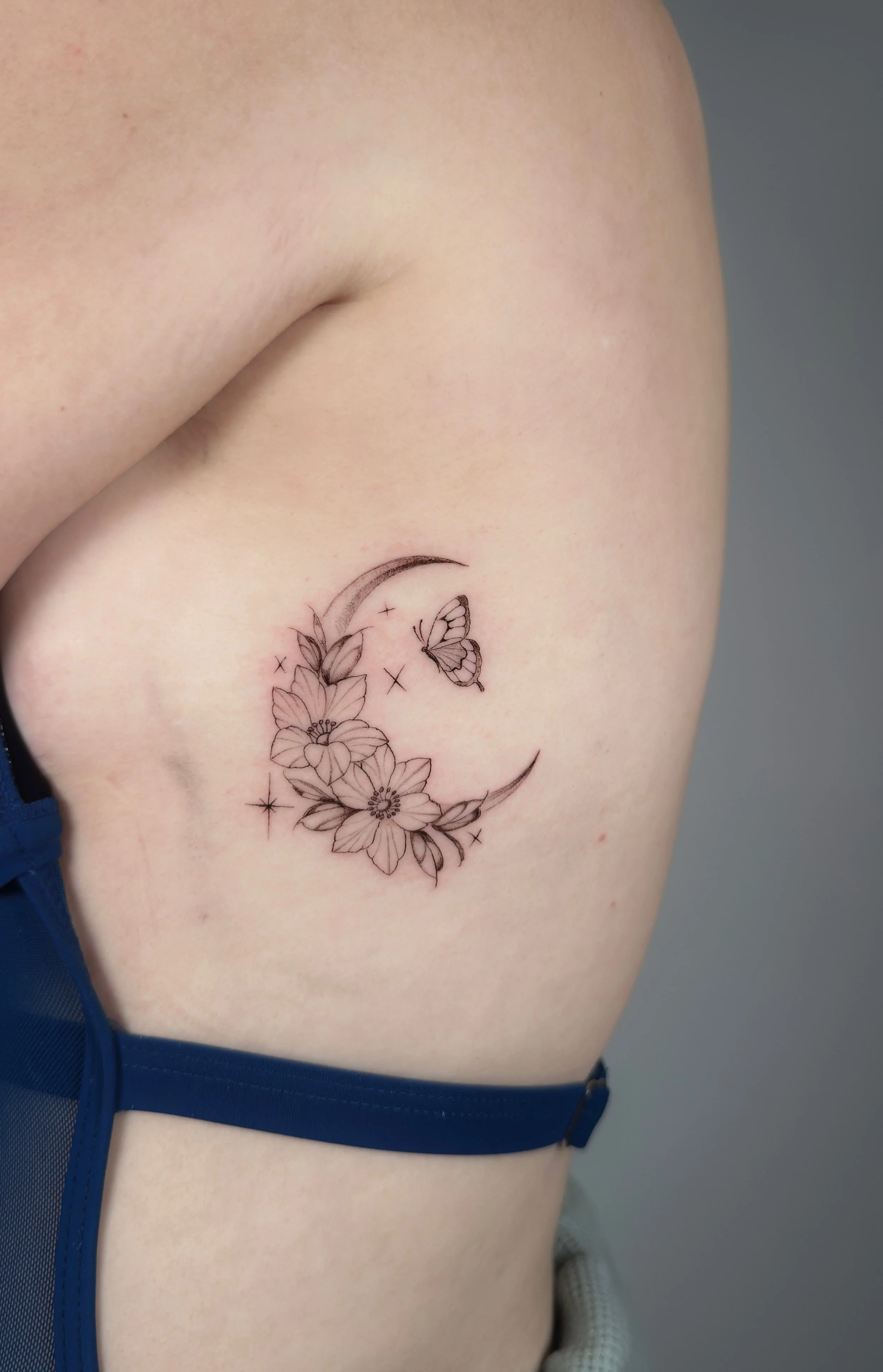 Sarah grew up in a small Minnesota farm town and discovered her passion for tattooing in 2022. She now specializes in black-and-grey fine line stipple work, focusing on floral, botanical, and nature-inspired designs.
